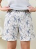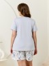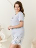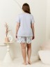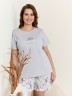 Пижама женская из трикотажного полотна «кулирка» в комбинации двух видовполотен: гладкокрашенного и с набивным рисунком, состоящая из футболки и шорт. Футболка женская из гладкокрашеного трикотажного полотна «кулирка», классического покроя, с короткими втачными рукавами, горловиной овальной формы, обработанной притачной бейкой из основного материала и принтом на полочке, выполненным в технике «шелкографии».Шорты – из полотна с набивным рисунком, удлиненные, свободного покроя, с эластичной тесьмой по талии.