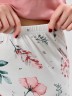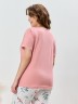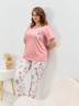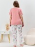 Пижама женская из трикотажного полотна «кулирка» в комбинации двух видов полотен: с набивным рисунком и гладкокрашенного в единой цветовой гамме, состоящая из футболки и брюк. Футболка - из гладкокрашенного полотна, классического покроя, с короткими втачными рукавами, горловиной овальной формы и принтом на полочке, выполненным в технике «шелкографии». Горловина, низ рукавов обработаны узким притачным кантом контрастного цвета.Брюки - длинные, с эластичной тесьмой по талии и притачными манжетами, которые обработаны с узким кантом контрастного цвета в соединительных швах.