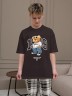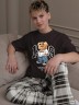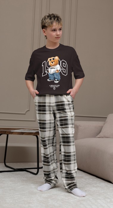 Костюм для мальчика, состоящий из футболки и брюк. Футболка однотонная с принтом на груди; модель свободная, со спущенной линией плеч, втачными короткими рукавами и овальным вырезом горловины. Брюки из полотна с набивным рисунком эксклюзивного дизайна, прямые, с боковыми карманами с обтачными входами, на притачном поясе с отстроченной эластичной тесьмой.