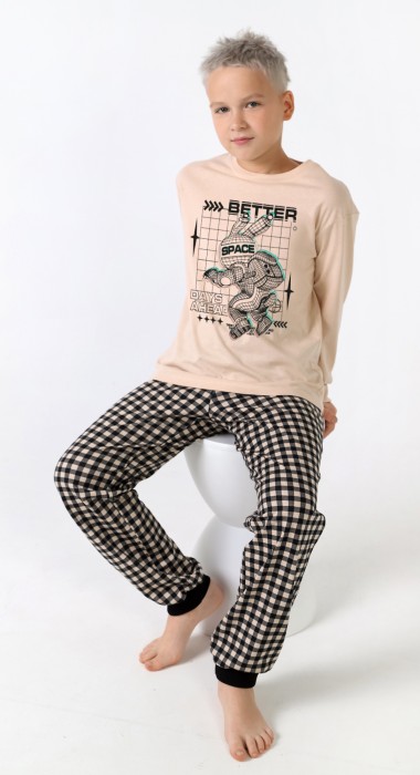 Пижама для мальчика, состоящая из футболки и брюк. Футболка - из гладкокрашеного трикотажного полотна "кулирка", классического покроя: с длинными втачными рукавами, горловиной овальной формы, обработанной втачной планкой и принтом в центре переда, выполненным в технике шелкографии. Брюки - из трикотажного полотна "кулирка" в клетку, длинные, с эластичной тесьмой на поясе и притачными манжетами из полотна "кашкорсе" черного цвета.