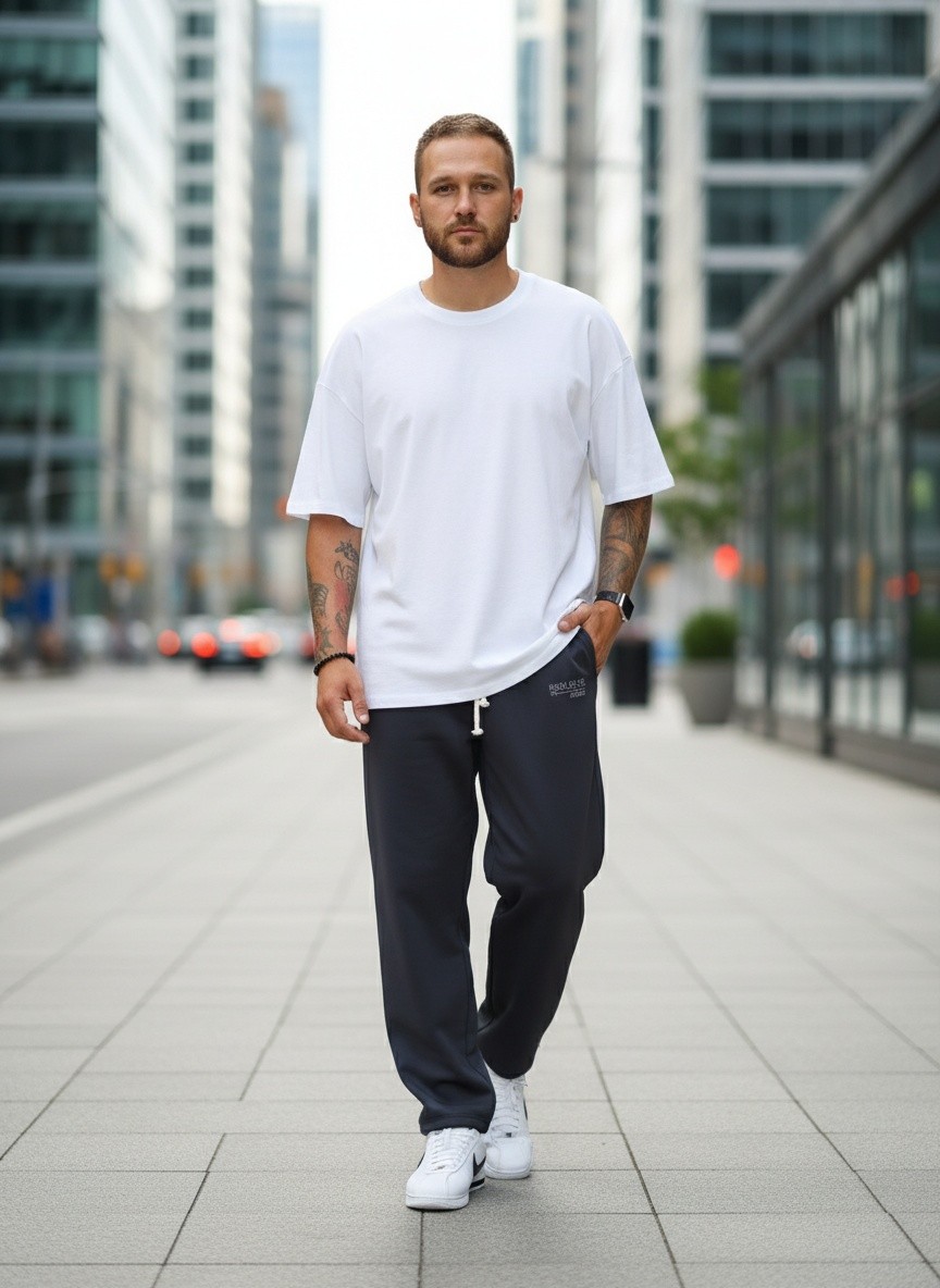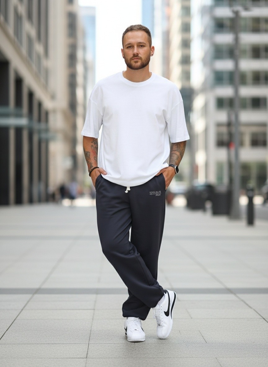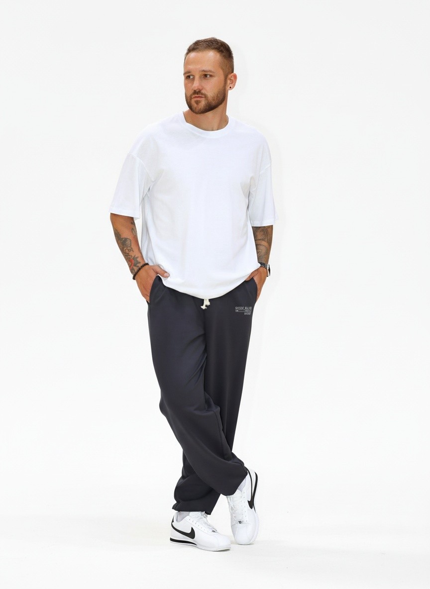 Брюки мужские из трикотажного полотна ""футер-двунитка"" на притачном поясе с эластичной тесьмой внутри, декоративными вставками в боковых швах и карманами, обработанными в соединительных швах передних половин с декоративными вставками. Нижние срезы брюк обработаны с эластичной тесьмой. По швам втачивания вставок и входам в карманы настрочены отделочные строчки. Через петлю пояса продет шнурок, позволяющий регулировать степень прилегания изделия по талии.