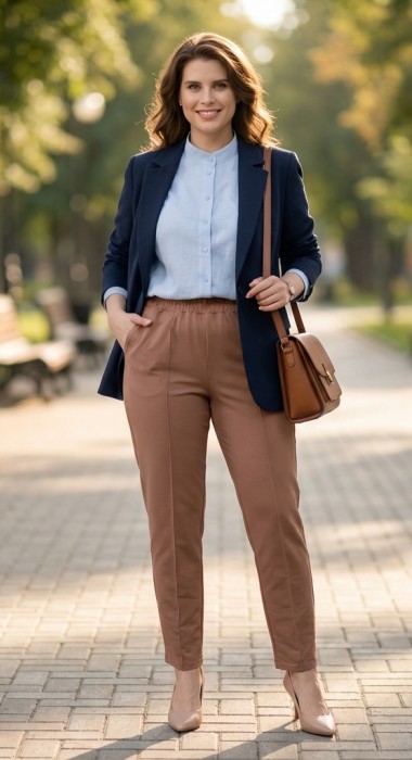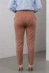 Брюки женские из трикотажного полотна «футер-двунитка», длинные, полуприлегающего силуэта, на притачном поясе с эластичной тесьмой внутри и карманами в боковых швах. Передние половины застрочены по центральным линиям, на задних половинах обработаны две вытачки в области талии.