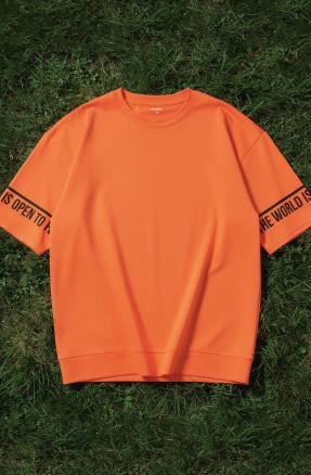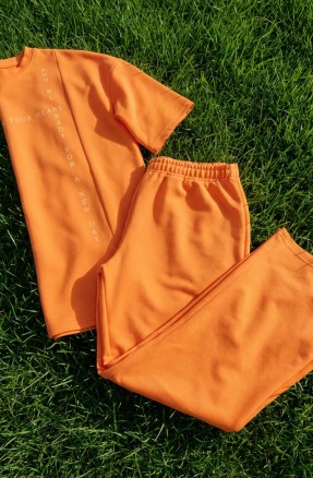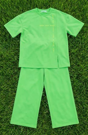 Брюки из трикотажного полотна «футер-двухнитка», слегка зауженные книзу, на притачном поясе с эластичной тесьмой внутри и карманами в боковых швах. Средний шов переда выполнен с имитацией застежки «гульфик». Передние половины - разрезные по линиям центра, а по швам стачивания выполнены отделочные строчки.