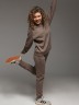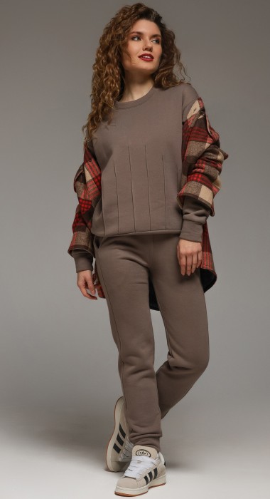 Костюм молодежный из гладкокрашеного трикотажного полотна «футер- трехнитка», состоящий из джемпера и брюк овальной формы, обработанной втачной планкой и притачным поясом по низу. Рукава – с притачными манжетами. Манжеты, планка горловины и пояс выполнены из полотна «кашкорсе» такого же цвета, как и основной материал. На полочке застрочены декоративные складочки-защипы, расположенные симметрично относительно линии центра. Брюки – длинные, на притачном поясе с эластичной тесьмой внутри и манжетами по низу. Передние половины – из двух частей каждая, со смещением соединтельных швов в сторону боковых срезов. Соединительные швы передних половин обработаны с карманами. Пояс и манжеты выполнены из трикотажного полотна «кашкорсе».