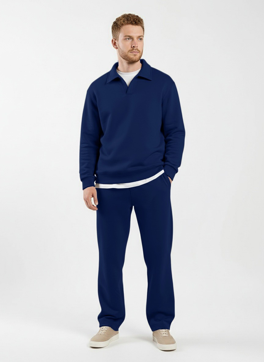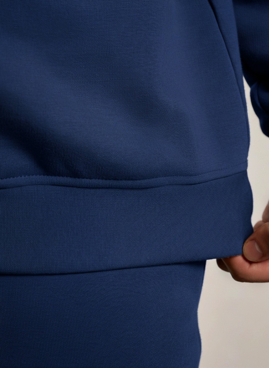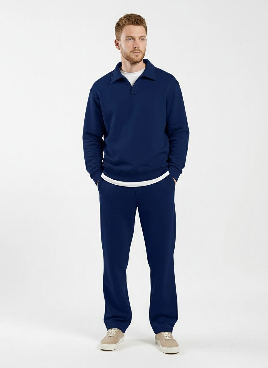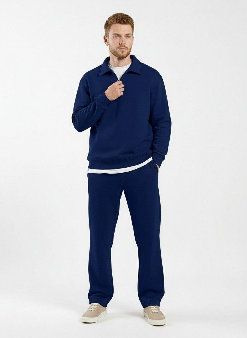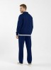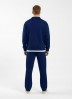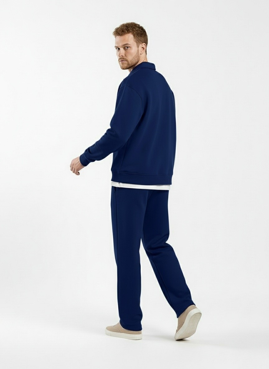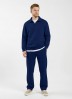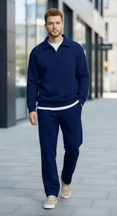 Костюм мужской из трикотажного полотна Футер 3-нитка с начесом, состоящий из джемпера и брюк. Джемпер - свободного покроя, с длинными втачными рукавами, приспущенным плечом, стояче-отложным воротником, втачанным в горловину v- образной формы, вырез которой обработан втачными планками-подбортами. Нижние срезы рукавов обработаны манжетами, низ изделия - притачным поясом. По воротнику, вырезу горловины, проймам и шву притачивания пояса настрочены отделочные строчки. Брюки - длинные, свободного покроя, на притачном поясе с эластичной тесьмой внутри, с карманами в боковых швах и отделочной строчкой по среднему шву переда, имитирующей застежку "гульфик"