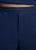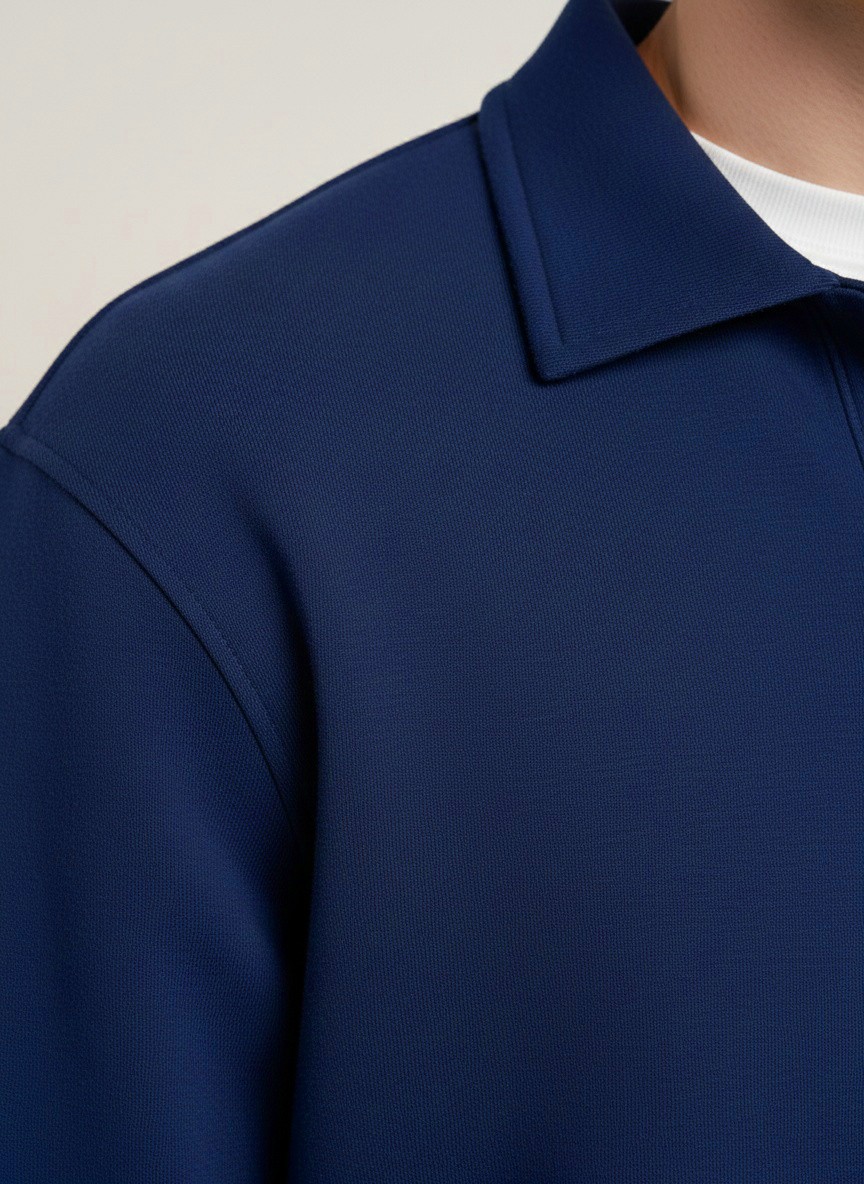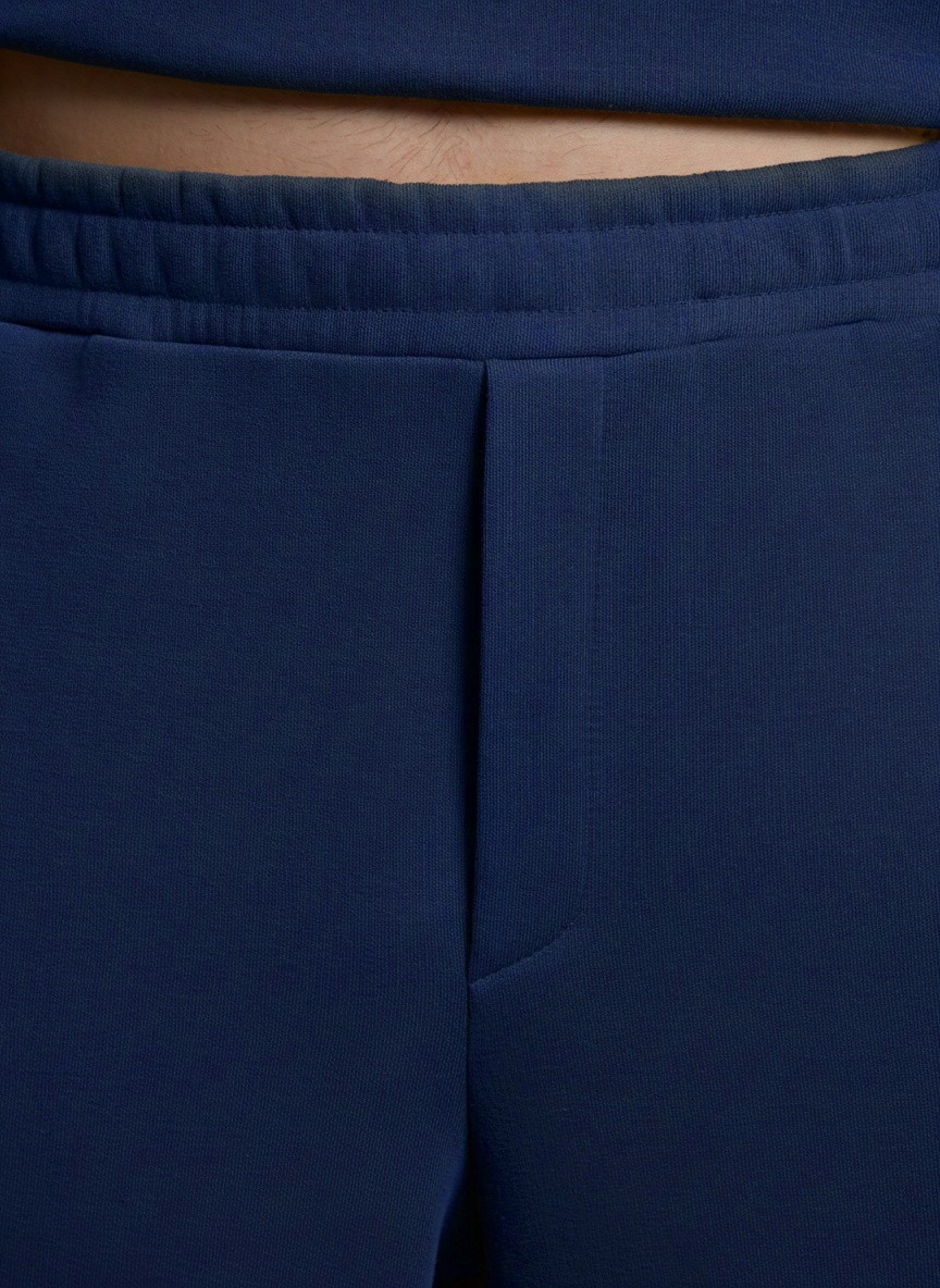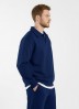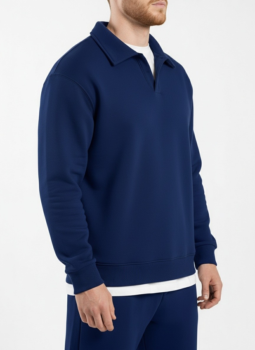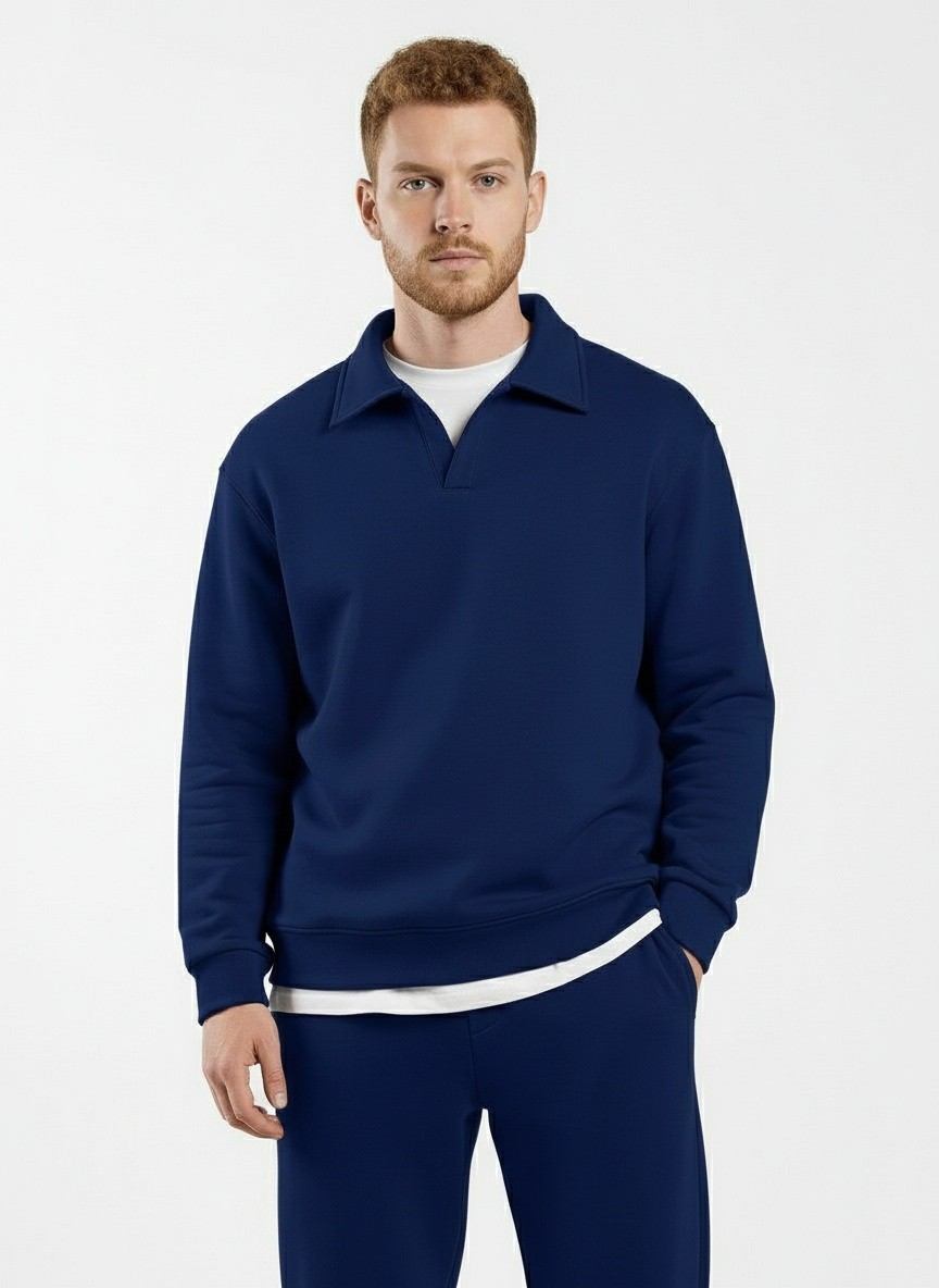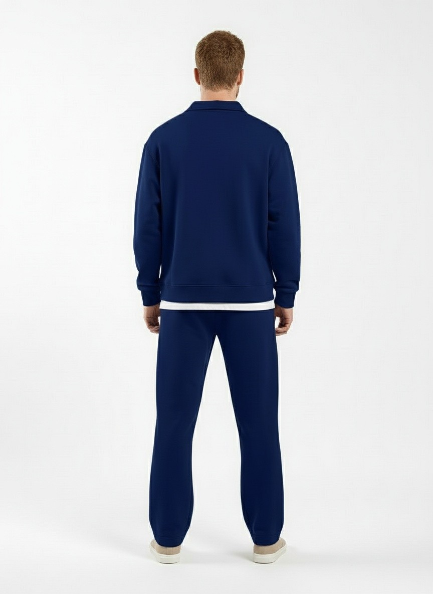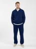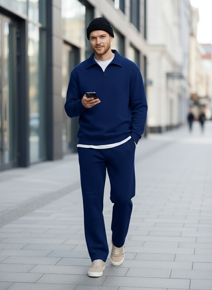 Костюм мужской из трикотажного полотна Футер 3-нитка с начесом, состоящий из джемпера и брюк. Джемпер - свободного покроя, с длинными втачными рукавами, приспущенным плечом, стояче-отложным воротником, втачанным в горловину v- образной формы, вырез которой обработан втачными планками-подбортами. Нижние срезы рукавов обработаны манжетами, низ изделия - притачным поясом. По воротнику, вырезу горловины, проймам и шву притачивания пояса настрочены отделочные строчки. Брюки - длинные, свободного покроя, на притачном поясе с эластичной тесьмой внутри, с карманами в боковых швах и отделочной строчкой по среднему шву переда, имитирующей застежку "гульфик"