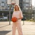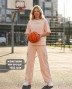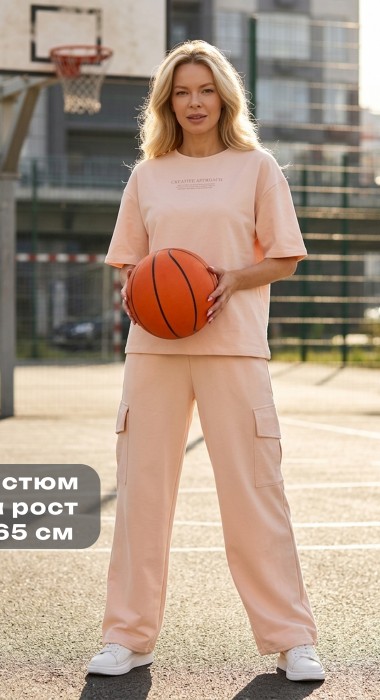 Костюм молодежный из трикотажного полотна «футер - двунитка», состоящий из футболки и брюк. Футболка - с короткими втачными рукавами, горловиной овальной формы, обработанной втачной планкой и принтом на полочке, выполненным в технике «шелкографии». Брюки-карго – длинные, свободные, на притачном поясе с эластичной тесьмой внутри, карманами в боковых швах. Дополнительные накладные карманы со складкой, закрывающиеся клапаном, располагаются по бокам в области бедер. Низ брюк обработан подгибкой с вложением эластичной тесьмы и регулируется по длине с помощью фиксатора.