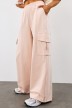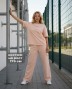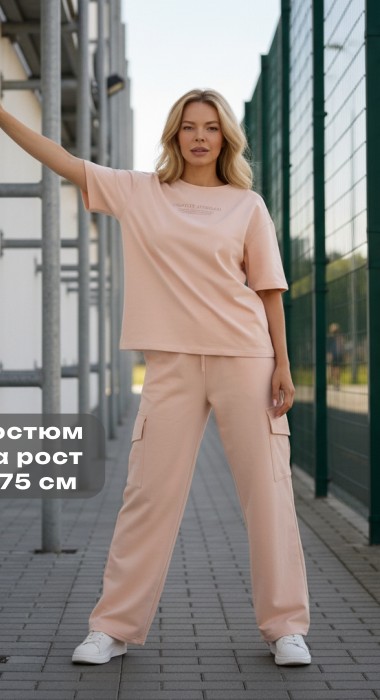 Костюм молодежный из трикотажного полотна «футер - двунитка», состоящий из футболки и брюк. Футболка - с короткими втачными рукавами, горловиной овальной формы, обработанной втачной планкой и принтом на полочке, выполненным в технике «шелкографии». Брюки-карго – длинные, свободные, на притачном поясе с эластичной тесьмой внутри, карманами в боковых швах. Дополнительные накладные карманы со складкой, закрывающиеся клапаном, располагаются по бокам в области бедер. Низ брюк обработан подгибкой с вложением эластичной тесьмы и регулируется по длине с помощью фиксатора.