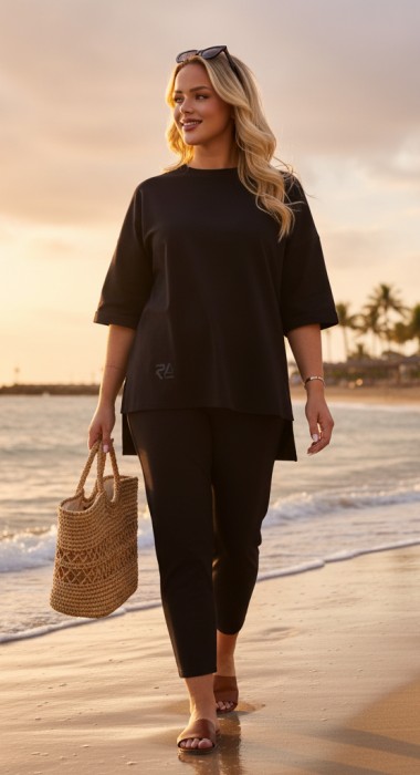 Джемпер – свободного покроя, с рукавами на основе цельнокроеных длиной до локтя, горловиной овальной формы, обработанной втачной планкой, разрезами в боковых швах и принтом на полочке. Рукава – с цельнокроеными манжетами-отворотами. Модный элемент- разность длины полочки и спинки на 10 см.