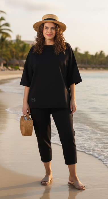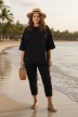 Брюки – укороченные, на притачном поясе с эластичной тесьмой внутри и карманами в боковых швах. На нижних частях передних и задних половин обработано по две вертикальные вытачки. Страна производитель Узбекистан