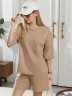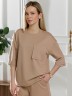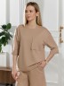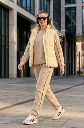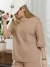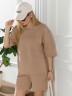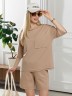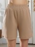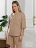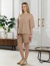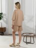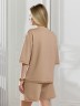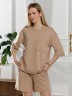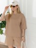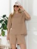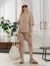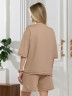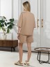 Костюм женский из гладкокрашеного трикотажного полотна "футер с вискозой", состоящий из футболки и шорт.Футболка - свободного покроя, с горловиной овальной формы, обработанной втачной планкой из основного материала, спущенной линией плеча, короткими втачными рукавами, с нагрудным карманом, настроченным на полочку. Нижние срезы рукавов и изделия выполнены без подгибки с имитацией второго слоя.Шорты – средней длины, свободные, на притачном поясе с эластичной тесьмой внутри, карманами в боковых швах. Нижние срезы шорт без подгибки с имитацией второго слоя.