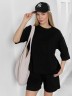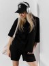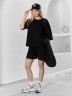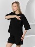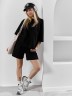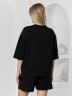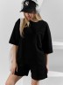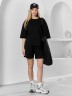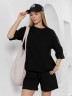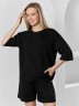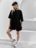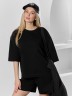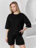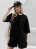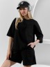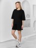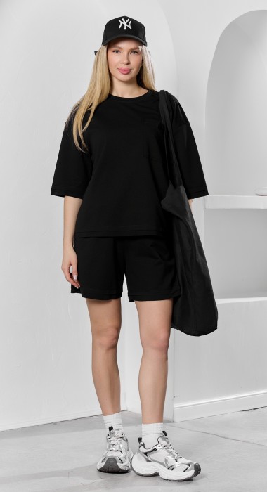 Костюм женский из гладкокрашеного трикотажного полотна "футер с вискозой", состоящий из футболки и шорт.Футболка - свободного покроя, с горловиной овальной формы, обработанной втачной планкой из основного материала, спущенной линией плеча, короткими втачными рукавами, с нагрудным карманом, настроченным на полочку. Нижние срезы рукавов и изделия выполнены без подгибки с имитацией второго слоя.Шорты – средней длины, свободные, на притачном поясе с эластичной тесьмой внутри, карманами в боковых швах. Нижние срезы шорт без подгибки с имитацией второго слоя.