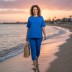 Костюм женский из гладкокрашеного трикотажного полотна футер-двунитка, состоящий из футболки и брюк. Футболка – классического покроя, с короткими втачными рукавами и горловиной овальной формы, обработанной втачной планкой. В нижней части полочки слева настрочен декоративный элемент прямоугольной формы.Брюки – длиной 7/8, слегка зауженные книзу, на притачном поясе с эластичной тесьмой внутри и карманами в боковых швах. Передние половины брюк застрочены по линиям центра вдоль на 0,3 см.