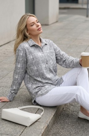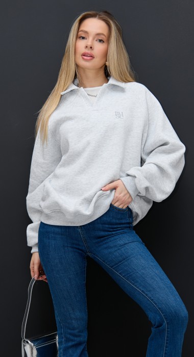 Толстовка женская из трикотажного полотна "кармеланж" с отделкой из полотна "кашкорсе", оверсайз, с рукавами покроя "реглан", стояче-отложным воротником и V-образным вырезом горловины, обработаннм втачными планками и вышивкой на детали переда. Притачной пояс по низу изделия и манжеты рукавов выполнены из полотна "кашкорсе" в цвет основого материала. По воротнику, швам реглана и шву притачивания пояса настрочены отделочные строчки.