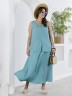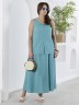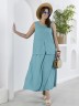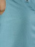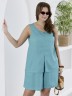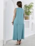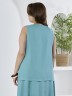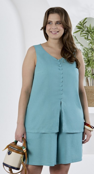 Блузка женская из гладкокрашеного тканого полотна, полуприталенного силуэта, без рукавов, с V-образной горловиной и вытачками в области груди. Перед состоит из двух частей, в шве соединения деталей разрез. От горловины до разреза пришиты декоративные пуговицы имитирующие застежку. Горловина и проймы окантованы основным материалом.