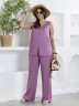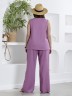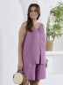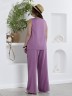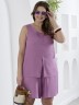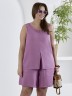 Блузка женская из гладкокрашеного тканого полотна, полуприталенного силуэта, без рукавов, с V-образной горловиной и вытачками в области груди. Перед состоит из двух частей, в шве соединения деталей разрез. От горловины до разреза пришиты декоративные пуговицы имитирующие застежку. Горловина и проймы окантованы основным материалом.