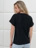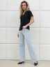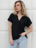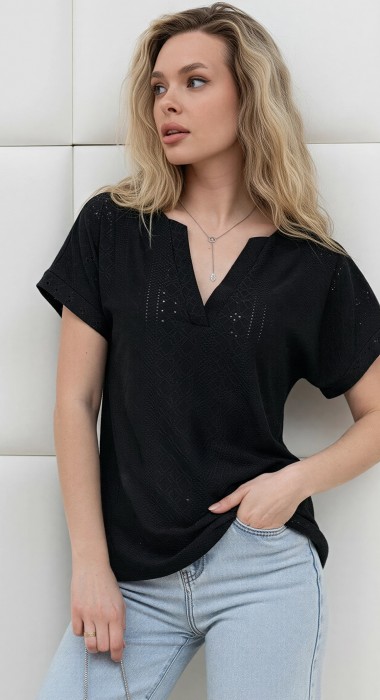 Блуза женская из гладкокрашенного трикотажного полотна «шитье», полуприталенного силуэта, с глубоким V-образным вырезом горловины, обработанным косыми планками, короткими цельнокроеными рукавами. Нижние срезы рукавов с притачными манжетами.