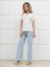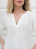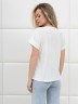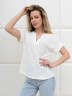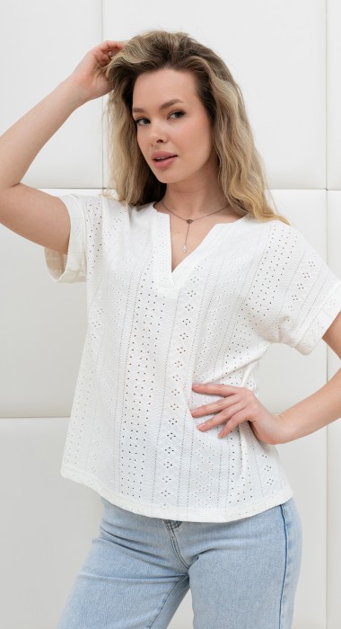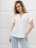 Блуза женская из гладкокрашенного трикотажного полотна «шитье», полуприталенного силуэта, с глубоким V-образным вырезом горловины, обработанным косыми планками, короткими цельнокроеными рукавами. Нижние срезы рукавов с притачными манжетами.