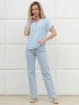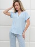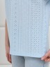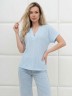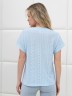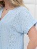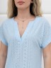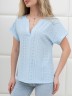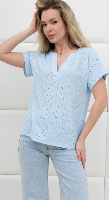 Блуза женская из гладкокрашенного трикотажного полотна «шитье», полуприталенного силуэта, с глубоким V-образным вырезом горловины, обработанным косыми планками, короткими цельнокроеными рукавами. Нижние срезы рукавов с притачными манжетами.