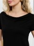 Блузка женская из гладкокрашеного вискозного полотна, полуприталенного силуэта, с короткими втачными рукавами. Акцентом блузки является горловина полочки с драпировкой «качели», создающей небольшой объем, горловина спинки окантована основным материалом.