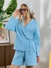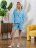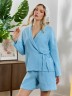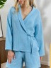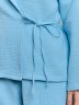 Блуза женская на запахе из фактурного гладкокрашеного полотна, с длинными рукавами, спущенным плечом и воротником "шаль". Низ изделия и рукавов обработаны подгибкой. Для фиксации изделия на фигуре предусмотрены шнуры из ркантовки, вставленные в правый бортовой и левый боковой швы.