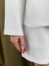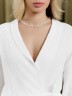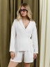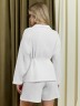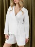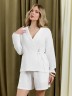 Блуза женская на запахе из фактурного гладкокрашеного полотна, с длинными рукавами, спущенным плечом и воротником "шаль". Низ изделия и рукавов обработаны подгибкой. Для фиксации изделия на фигуре предусмотрены шнуры из ркантовки, вставленные в правый бортовой и левый боковой швы.