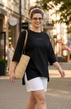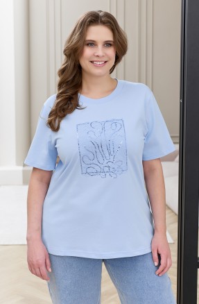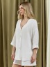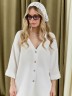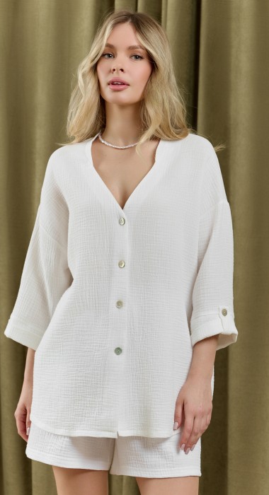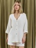 Блузка женская из фактурного гладкокрашеного полотна, с втачными рукавами длиной 3/4, с центральной бортовой застежкой на 4 обметанные петли и 4 пуговицы, с горловиной фигурной формы и небольшим отделочным воротником. Нижние срезы рукавов и низ изделия обработаны подгибкой. Рукава - с хлястиками, с петлей и пуговицей, позволяющими регулировать длину рукавов на фигуре и создающими красивую драпировку.