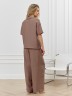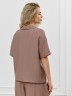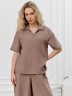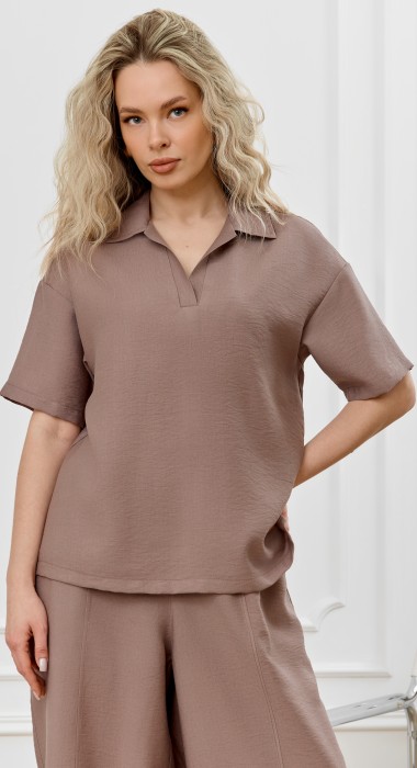 Блуза женская из фактурного полотна, с короткими втачными рукавами и стояче-отложным воротником. V-образный вырез горловины обработан втачными планками. Нижние срезы рукавов и изделия обработаны подгибкой. По воротнику настрочена отделочная строчка.