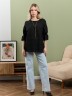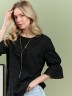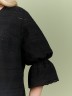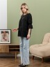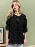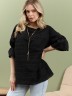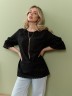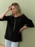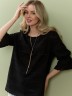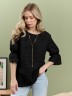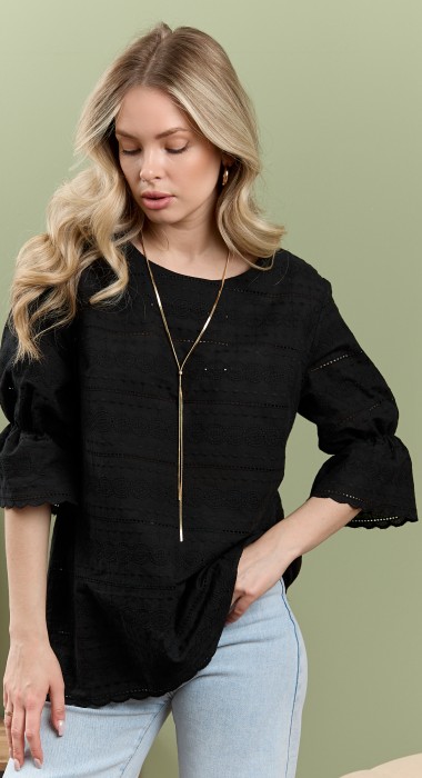 Блузка женская из тканого гладкокрашеного полотна «шитье» прямого силуэта, с горловиной овальной формы, обработанной окантовкой и подогнутой внутрь, втачными рукавами ¾ длины, присборенными на уровне локтевого сгиба с помощью эластичной тесьмы. Нижние срезы рукавов и изделия с «фестонным» краем.