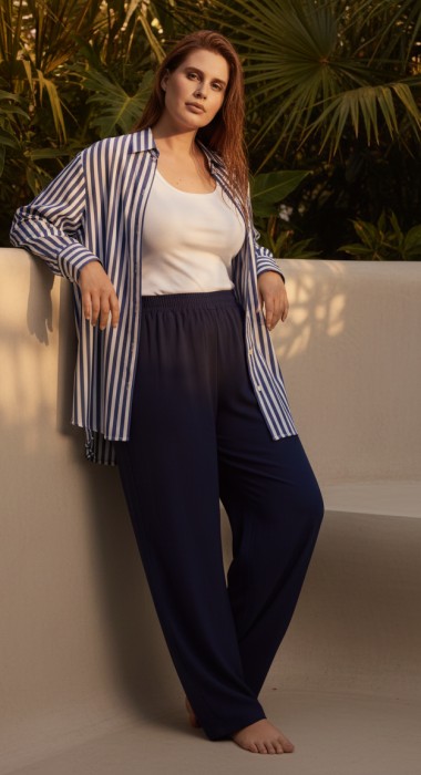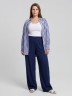 Блузка-рубашка женская из штапельного полотна с набивным рисунком «полоска», свободного кроя, удлиненная, со стояче-отложным воротником, спущенным длинным рукавом. Перед из двух частей с центральной бортовой застежкой на петли и пуговицы, спинка цельнокроеная. Низ рукава с притачной манжетой, застегивающейся на петлю и пуговицу.