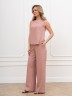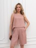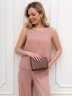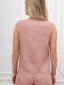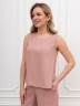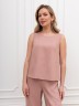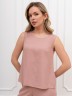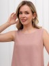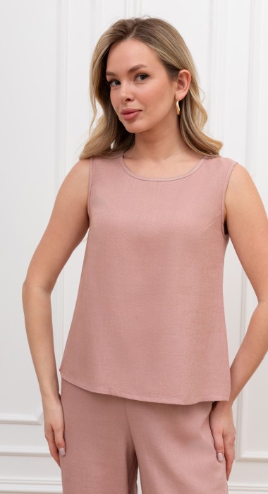 Блузка-топ женская из гладкокрашеного тканого полотна, полуприталенного силуэта, без рукавов, с горловиной овальной формы. Горловина и проймы окантованы основным материалом.