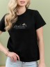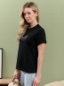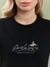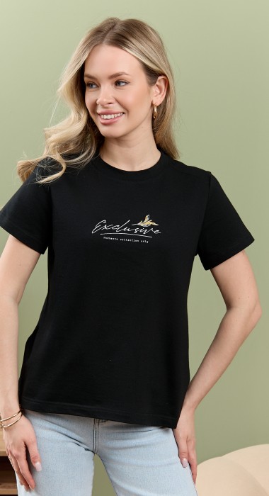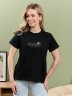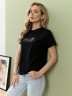 Футболка женская из гладкокрашеного полотна «кулирка», классического покроя, с короткими втачными рукавами, горловиной овальной формы, принтом на полочке, выполненным в технике «шелкографии». Плечевые швы изделия переходят на деталь