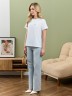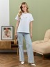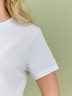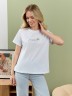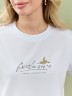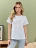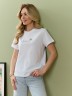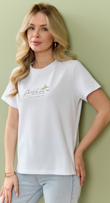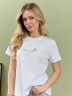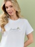 Футболка женская из гладкокрашеного полотна «кулирка», классического покроя, с короткими втачными рукавами, горловиной овальной формы, принтом на полочке, выполненным в технике «шелкографии». Плечевые швы изделия переходят на деталь
