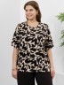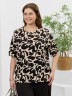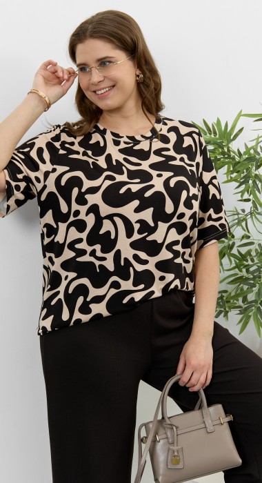 Футболка женская из вискозного трикотажного полотна с набивным рисунком, классического покроя, с горловиной овальной формы, обработанной широкой втачной планкой, с короткими втачными рукавами.