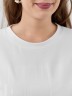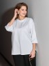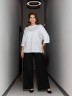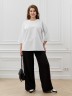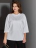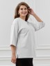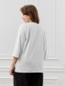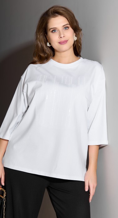Футболка женская из гладкокрашенного трикотажного полотна «кулирка с лайкрой», свободного покроя, со спущенным плечом и втачными рукавами длиной до локтя, горловиной овальной формы, обработанной втачной планкой. По центру полочки выполнена вышивка «пайетками» в тон изделия. В нижней части боковых швов небольшие разрезы.
