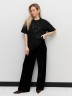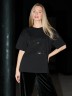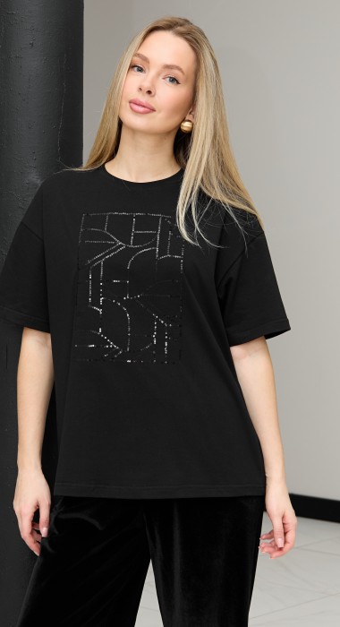 Футболка женская из гладкокрашенного трикотажного полотна «кулирка с лайкрой», свободного покроя, с короткими втачными рукавами, горловиной овальной формы, обработанной втачной планкой. По центру полочки выполнена вышивка «пайетками» в тон изделия.