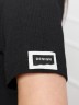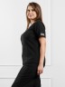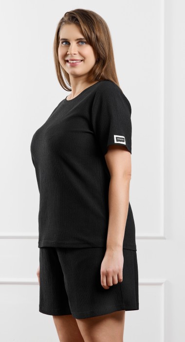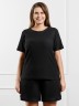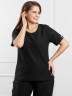 Футболка женская из гладкокрашенного трикотажного полотна «бурумчук», прямого силуэта, с короткими втачными рукавами, горловиной овальной формы, обработанной втачной планкой. По центру полочки ниже горловины - настрочен декоративный элемент-нашивка.