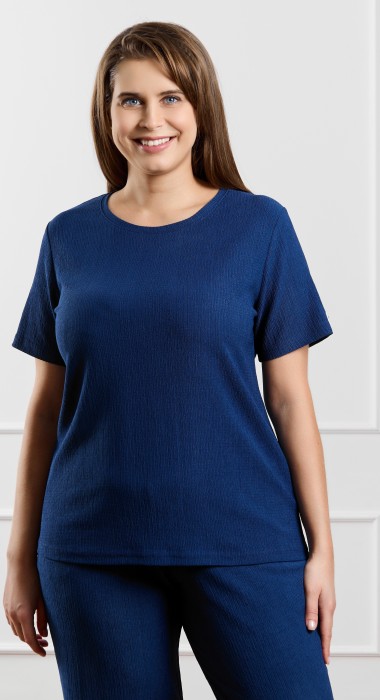 Футболка женская из гладкокрашенного трикотажного полотна «бурумчук», прямого силуэта, с короткими втачными рукавами, горловиной овальной формы, обработанной втачной планкой. По центру полочки ниже горловины - настрочен декоративный элемент-нашивка.