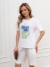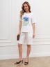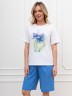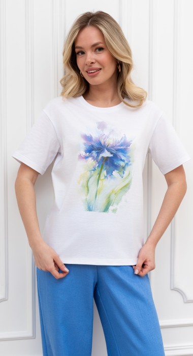 Футболка женская из гладкокрашеного трикотажного полотна «кулирка», классического кроя, с горловиной овальной формы, короткими втачными рукавами. На полочке выполнена печать в технике «шелкографии», горловина обработана втачной планкой с отделочной строчкой по шву притачивания.