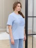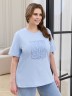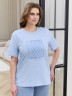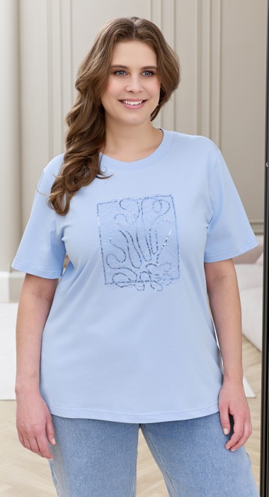 Футболка женская из гладкокрашеного трикотажного полотна «кулирка с лайкрой», полуприталенного силуэта, с горловиной овальной формы, обработанной втачной планкой и короткими рукавами. На полочке выполнена объемная вышивка «пайетками» на гипюровом кружеве в контрастных цветах.