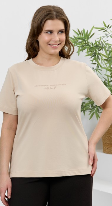 Футболка женская из гладкокрашеного трикотажного полотна «кулирка с лайкрой», полуприталенного силуэта, с втачными короткими рукавами. На полочке выполнена печать в технике «шелкографии». Горловина овальной формы обработана втачной планкой с отделочной строчкой по шву притачивания.