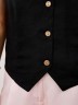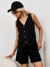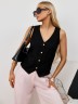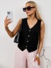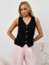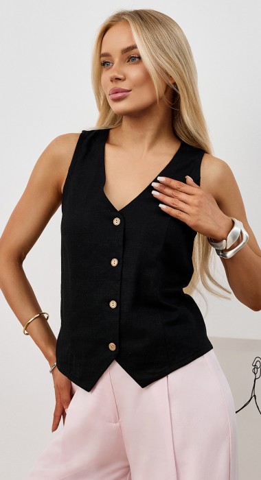 Жилет молодежный из плательной ткани "лен-вискоза" полуприлегающего силуэта с рельефными вытачками на полочке, рельефами на спинке для комфортной посадки по фигуре, без подкладки, с центральной бортовой застежкой на петли и пуговицы.