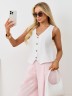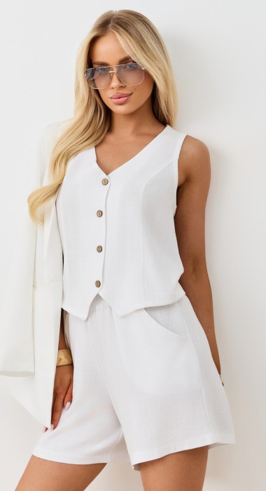 Жилет молодежный из плательной ткани "лен-вискоза" полуприлегающего силуэта с рельефными вытачками на полочке, рельефами на спинке для комфортной посадки по фигуре, без подкладки, с центральной бортовой застежкой на петли и пуговицы.