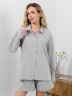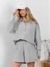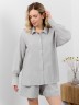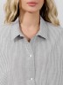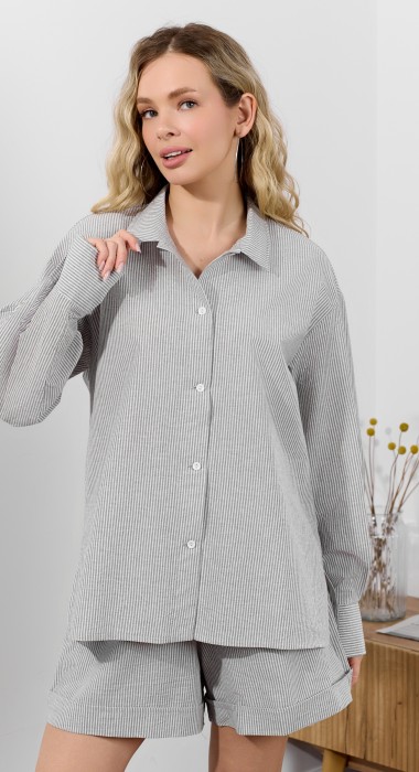 Рубашка – женская из тканого полотна «хлопок вареный» с набивным рисунком «узкая полоса», прямого силуэта, с длинными втачными рукавами на притачных манжетах, стояче-отложным воротником, центральной бортовой застежкой на петли и пуговицы и небольшими разрезами по боковым швам.