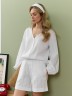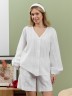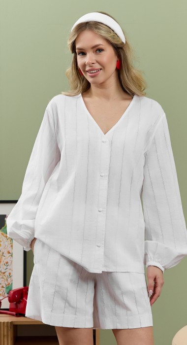 Рубашка женская из гладкокрашеного тканого полотна «батист» шитье, свободного покроя, с глубокой V-образной горловиной, длинными широкими рукавами, понизу обработанными подгибкой, с вложением эластичной тесьмы создающей эффект «фонарика». Горловина обработана внутренними обтачками, центральная бортовая застежка на петли и пуговицы.