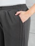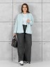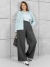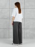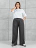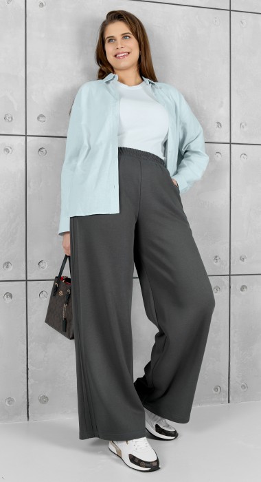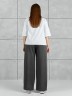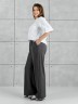 Брюки женские из гладкокрашенного трикотажного полотна «лининг» прямого кроя, длинные, свободные, расширенные к низу, на поясе с эластичной тесьмой внутри, карманами в боковых швах. Передние половины застрочены двумя параллельными линиями, смещенными к боковым швам.