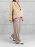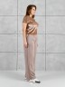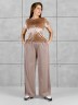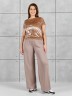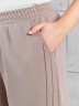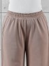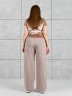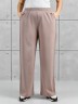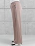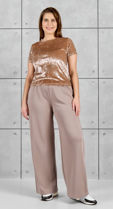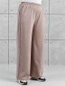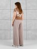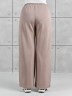 Брюки женские из гладкокрашенного трикотажного полотна «лининг» прямого кроя, длинные, свободные, расширенные к низу, на поясе с эластичной тесьмой внутри, карманами в боковых швах. Передние половины застрочены двумя параллельными линиями, смещенными к боковым швам.