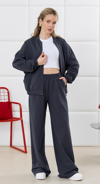 Брюки молодежные из трикотажного гладкокрашенного полотна «футер», длинные, на притачном поясе с эластичной тесьмой внутри, с карманами в боковых швах. Правая и левая половины брюк состоят из трех частей, скроенных по косой, с отделочными строчками по шву стачивания.