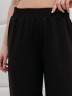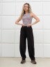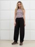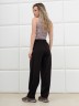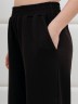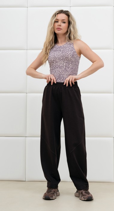 Брюки женские из трикотажного гладкокрашенного полотна «футер вискозный», слегка зауженные, стандартной длины, на притачном поясе с эластичной тесьмой внутри, с карманами в боковых швах. Правая и левая половины брюк состоят из двух частей, скроенных по косой, с отделочными строчками по шву стачивания. На нижних частях передних и задних половин застрочены вытачки.