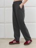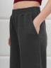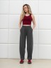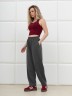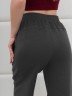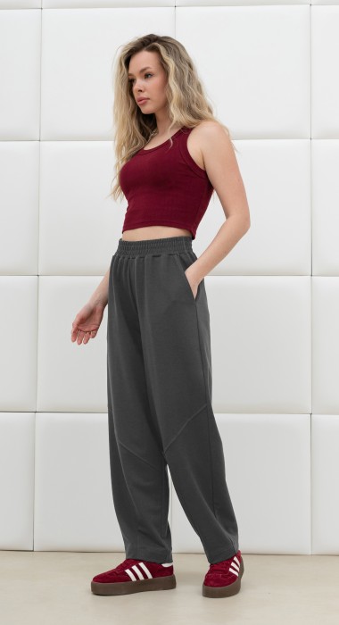 Брюки женские из трикотажного гладкокрашенного полотна «футер вискозный», слегка зауженные, стандартной длины, на притачном поясе с эластичной тесьмой внутри, с карманами в боковых швах. Правая и левая половины брюк состоят из двух частей, скроенных по косой, с отделочными строчками по шву стачивания. На нижних частях передних и задних половин застрочены вытачки.